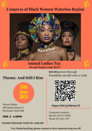 Join us for the 28th Annual Congress of Black Women Waterloo Region Tea. This year's theme is "And Still I (We) Rise," honouring the enduring spirit of Black women. Please take a look at the event details on the attached flyer. Scan the flyer's QR code or click the link below to purchase your tickets.