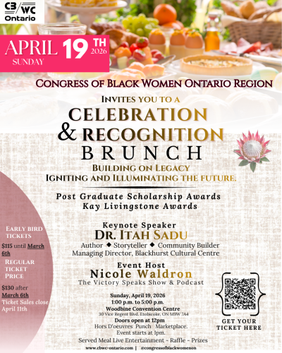 Please join the Congress of Black Women, Ontario Region at our Celebration and Recognition Brunch on Sunday, April 19, 2026 from 1:00pm to 5:00pm.