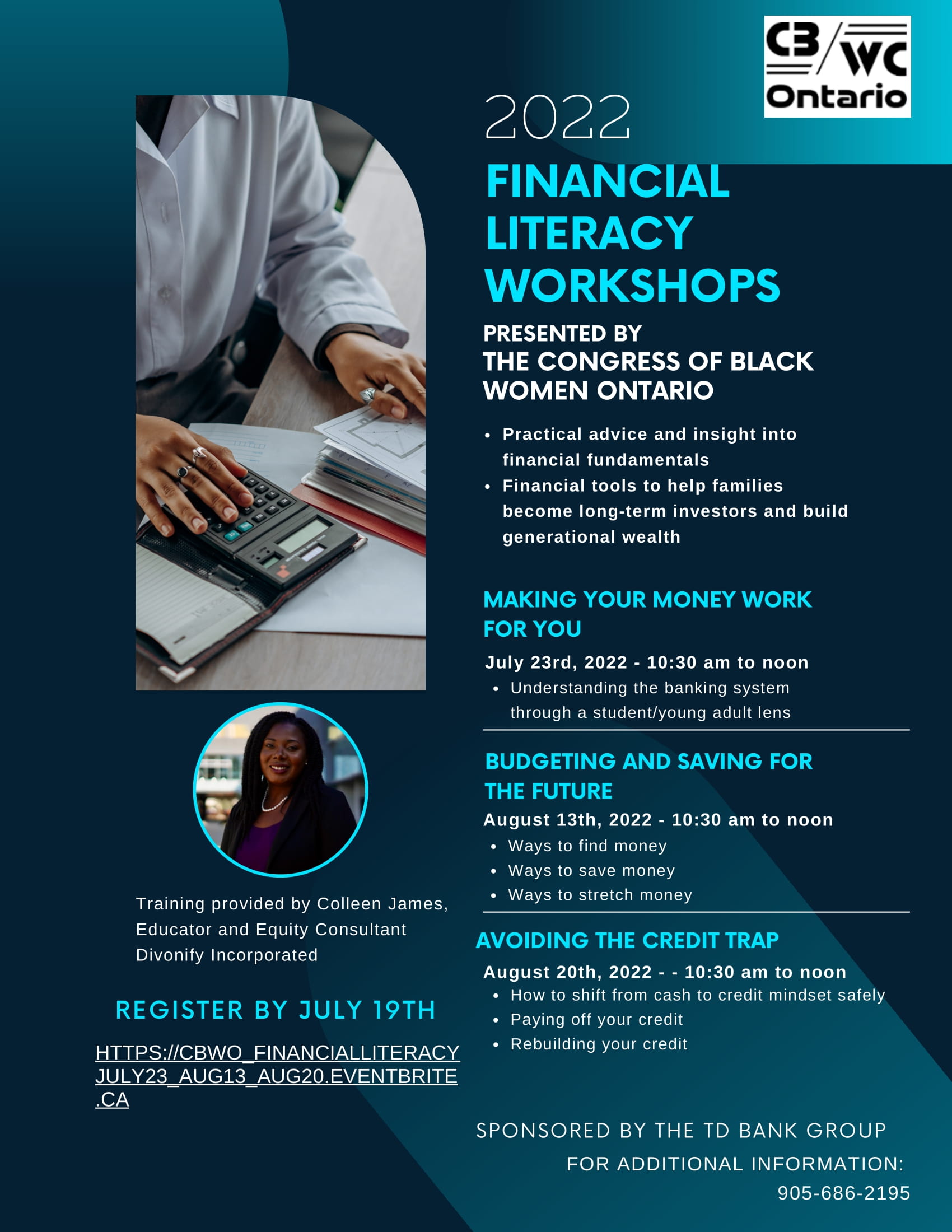Registration: https://www.eventbrite.ca/e/financial-literacy-workshops-july-23-august-13-august-20-2022-tickets-344487731077